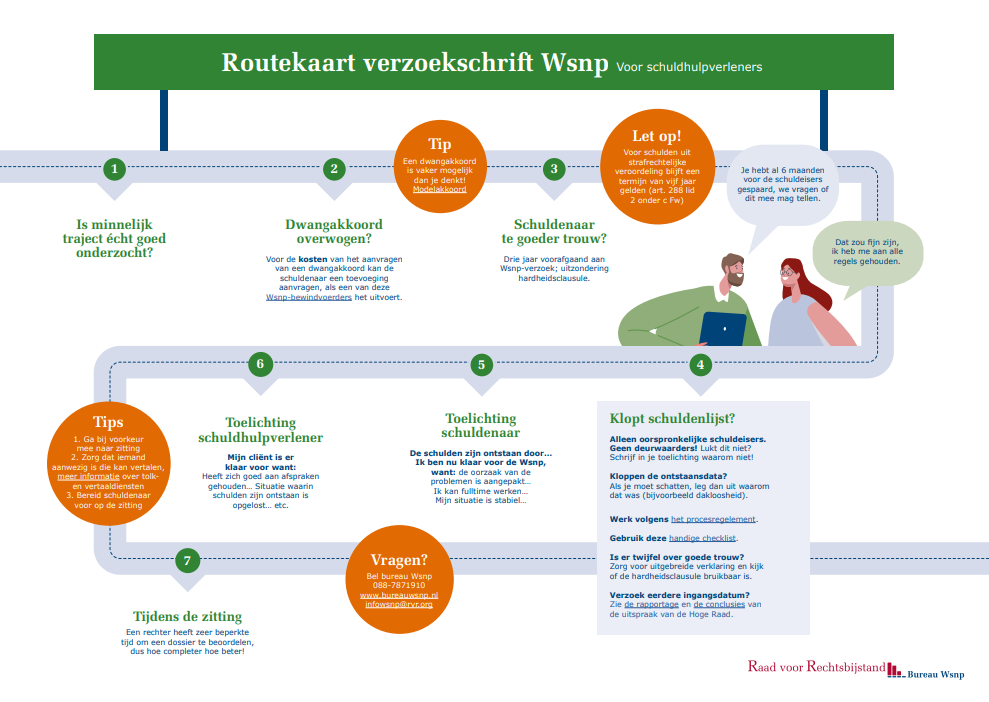 De routekaart verzoekschrift Wsnp is een handige infographic waarin u puntsgewijs de belangrijkste toelatingscriteria kunt nagaan in het kader van de toelating tot de Wsnp. Zo kunt u nagaan of alle vereiste stappen zijn doorlopen en of de schuldenaar voldoet aan de belangrijkste vereisten.